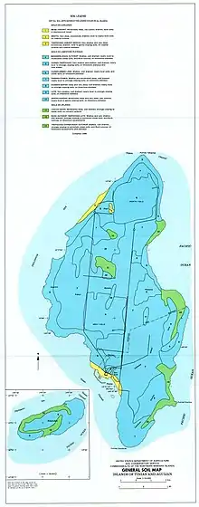 Topographic map of the island of Tinian, showing buildings as of 1999.