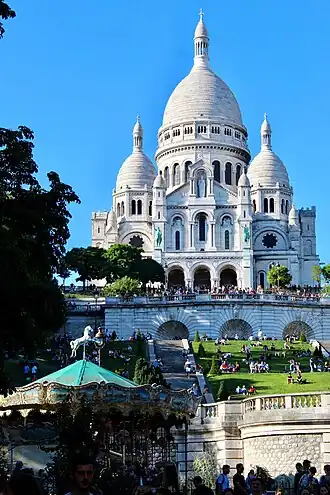 1870年普法戰爭和1871年巴黎公社期間,巴黎再一次遭到戰爭的破壞。1871年5月24日,巴黎公社放火燒燬巴黎的大量主要建築[47]。此後巴黎經歷第二次大規模發展時期。作為法國大革命一百週年紀念,同時為了迎接1889年世界博覽會,巴黎政府於1889年修建埃菲爾鐵塔,這次世界博覽會也讓巴黎成為世界上重要的觀光與貿易中心[48]。埃菲爾鐵塔直到1930年帝國大廈落成之前都是世界上最高的建築物。巴黎政府為迎接1900年世界博覽會修建巴黎地鐵,同時建造大皇宮和小皇宮。