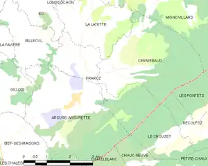 与弗拉罗接壤的市镇(或旧市镇、城区)包括:拉拉泰特、绍讷沃、勒克鲁泽、阿叙尔-阿叙雷特、比莱屈、塞尔涅博、里镇[2]。