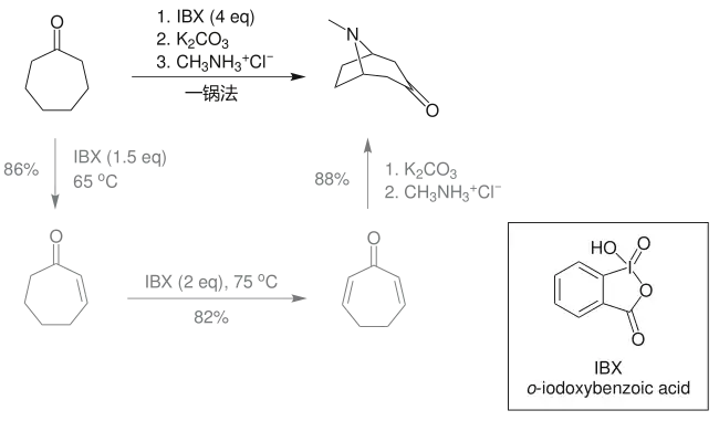 最近,K. C. Nicolaou 采用过量的2-碘酰基苯甲酸(IBX)试剂,利用一锅法反应,将醇(环庚醇)氧化成酮的同时形成α,β-不饱和结构,进一步加入甲胺可直接生成托品酮及其类似物: