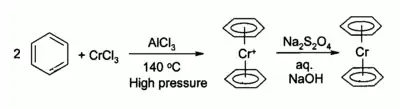 无水三氯化铬是有机金属化学中的重要原料。以它为原料可以制得很多有机铬化合物,比如结构上与二茂铁类似的二苯铬(下图)。三氯化铬也是很多铬(III)配合物的起始原料。