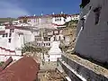 近处红色建筑为羊八犍,最左侧金顶者为斯东康,稍远处白色建筑为措钦大殿