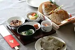 常見的端午節食品還有赤飯、鯛魚、蝦、鯉魚、出世魚、鰹魚、竹筍等。赤飯、連頭尾的鯛魚、蝦是日本常見的慶賀場合食品。端午節食用的鯉魚通常烹調成糖醋炸鯉魚,其寓意與鯉魚旗相同,同樣取自「鯉躍龍門」和「離水鯉魚」之說,祝願男孩健康成長、勇敢無畏、出人頭地。出世魚是指成長的不同階段有不同日語名稱的魚,常見的有鰤魚、鱸魚、鯔魚等,出世魚有如古代日本武士也會因應人生不同階段去使用不同的名字,故有祝願男孩平安長大、出人頭地的含義。鰹魚的日語讀音與「勝男」同音,寓意「勝利的男兒」。竹筍是端午節當季的蔬菜,竹子又生長迅速,竹筍料理代表希望男孩快高長大。傳統的端午節句料理其中一種常見組合是插上菖蒲根的蝦湯、糖醋炸鯉魚、鹽燒鯛魚、煮筍、竹內皮拌梅乾和青豆飯[109][110]。