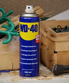 WD-40(NASDAQ:WDFC)是一種註冊商標的多用途潤滑防鏽石油製劑品牌,由WD-40公司(總公司位於美國加州聖地牙哥市)製造銷售。WD-40原本預定發展為一種隔水抗鏽劑[1],但產品上市後人們漸漸發現它也可以作為輕度潤滑用油或是溶劑、除膠劑、清潔劑使用,進而漸漸轉變用途。由於其多用途的特性,WD-40是一種難以嚴格歸類或定義的特殊商品。